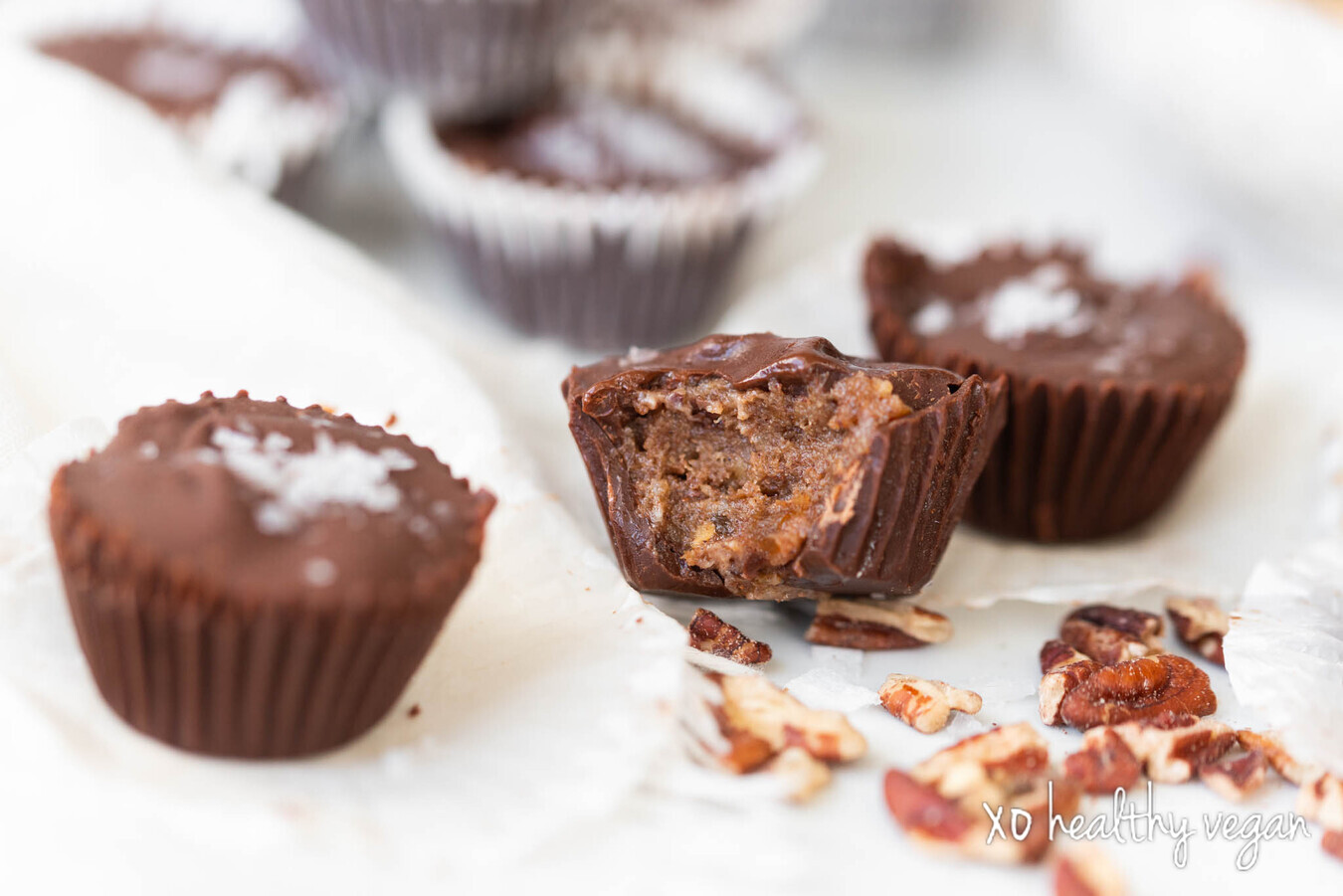 - Place in freezer for 10 minutes, or until chocolate is set. Spoon pecan mixture evenly over chocolate in each cup. Top each with more melted chocolate until cup is full. Sprinkle each cup with flaky sea salt.